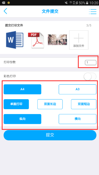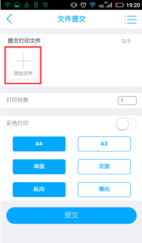 进入印橡云打印APP主界面,选择“文件提交”,进入文件提交的界面,点击“+”号选择添加文件,最多支持一次同时提交5份文件,可以提交包括word,excel,ppt,pdf,txt以及各种格式的图片等多种格式文件。