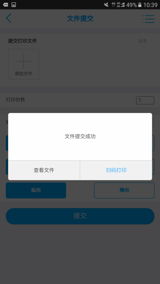 同时在文件提交界面具备打印的份数选择(最大支持99份),彩色打印开关,A4/A3选择项,单/双面选择项,纵/横向选择项,满足用户多种打印需求!